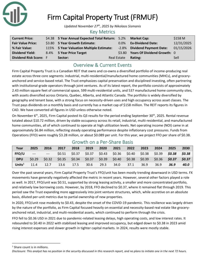 Firm Capital Property Trust is a Canadian REIT that owns and co-owns a diversified portfolio of income-producing real estate across three core segments: industrial, multi-residential/manufactured home communities (MHCs), and grocery anchored and service-based retail.