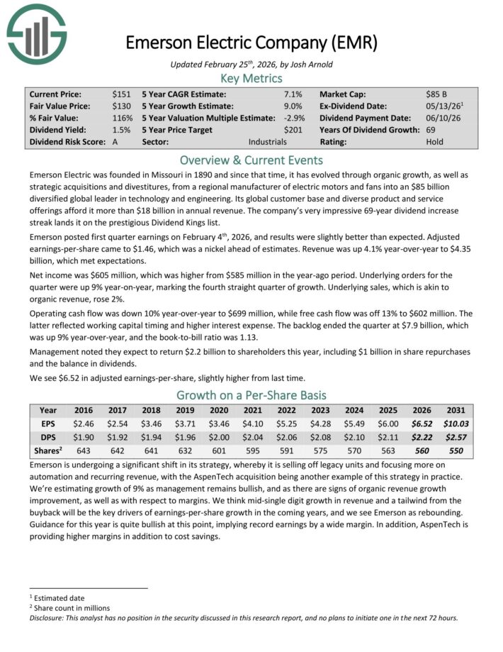 Emerson posted first quarter earnings on February 4th, 2026, and results were slightly better than expected. Adjusted earnings-per-share came to $1.46, which was a nickel ahead of estimates. Revenue was up 4.1% year-over-year to $4.35 billion, which met expectations.