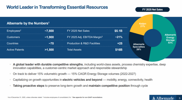 Albemarle provided an outlook for 2026 as well, with the company expecting revenue in a range of $5.7 to $6.0 billion. The company is expected to produce earnings-per-share of $6.96 in 2026.