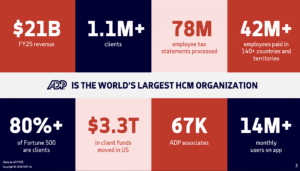 ADP is a business outsourcing services company. It was founded in 1949 and began with a single client. In the 75 years since, ADP has grown into the leading payroll and human resource outsourcing company. It has over 1 million clients in more than 140 countries worldwide.