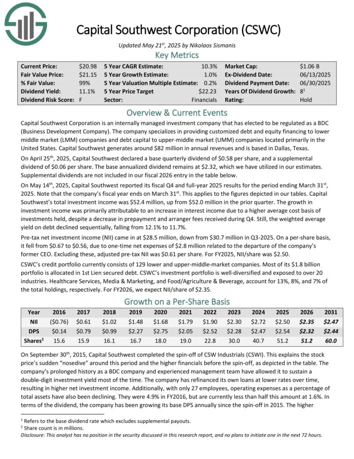 Investors should also be aware of the risk factors associated with investing in BDCs, such as the use of leverage, interest rate risk, and default risk.