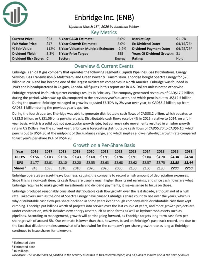 For the current year, Enbridge is forecasting distributable cash flows of CAD$5.70 to CAD$6.10, which pencils out to US$4.30 at the midpoint of the guidance range.