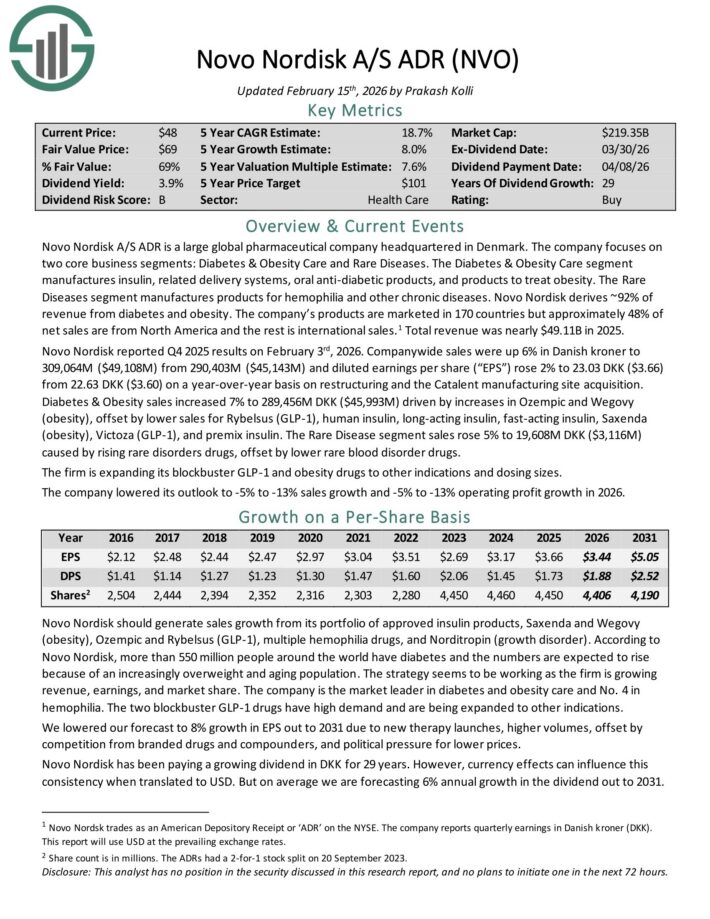 Novo Nordisk reported Q4 2025 results on February 3rd, 2026. Companywide sales were up 6% in Danish kroner and diluted earnings per share rose 2% to 23.03 DKK ($3.66) from 22.63 DKK ($3.60) on a year-over-year basis.
