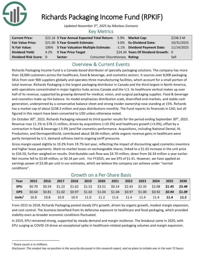 Richards Packaging Income Fund is a Canada-based distributor of specialty packaging solutions. The company has more than 18,000 customers across the healthcare, food & beverage, and cosmetics sectors.