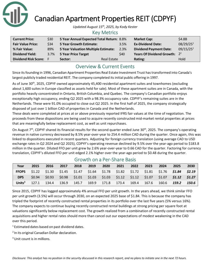 As of June 30th, 2025, CDPYF owned approximately 45,400 residential apartment suites and townhomes (excluding about 1,600 suites in Europe classified as assets held for sale). Most of these apartment suites are in Canada, with the portfolio heavily concentrated in Ontario, British Columbia, and Quebec.