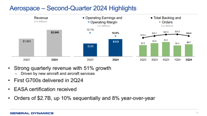 Aerospace revenue rose 4.1% to $3,062M from $2,940M in the prior year. The total backlog is $18,903M, increasing for the first time in a year. Gulfstream’s book-to-bill ratio was 1.3X.