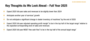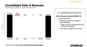 Caterpillar’s sales and revenues totaled $64.8 billion for the full year, a 3% decline from 2023, primarily due to lower sales volumes. However, the company maintained strong profitability, with an operating profit margin of 20.2%, up from 19.3% in 2023. Full-year profit per share increased to $22.05 from $20.12, while adjusted profit per share rose to $21.90 from $21.21. The company attributed these results to strategic pricing and operational efficiency, which helped offset declining equipment sales.
