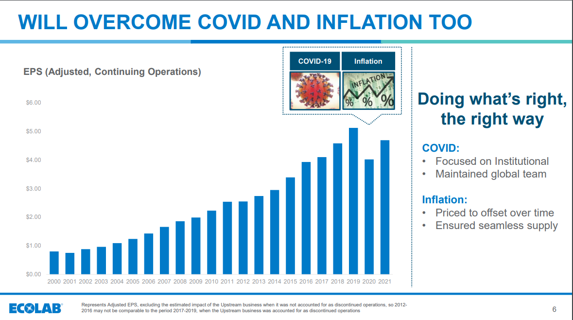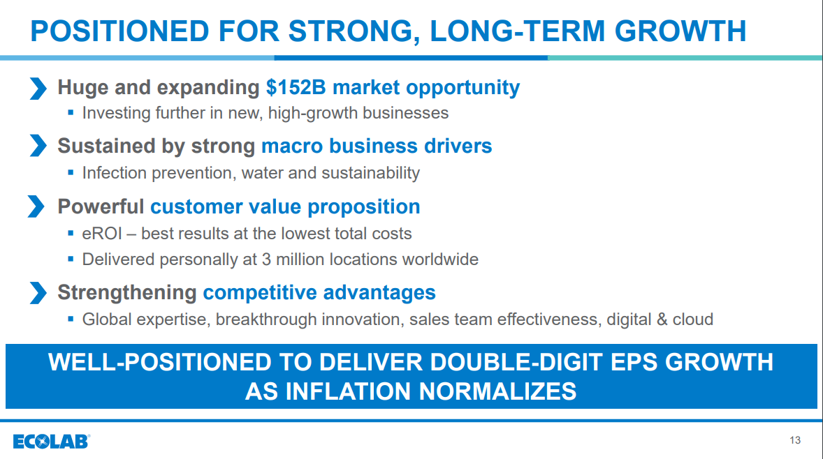 We feel that the company is well-positioned to continue growing. Over the next five years, we expect ECL to grow earnings per share by 10% per year.