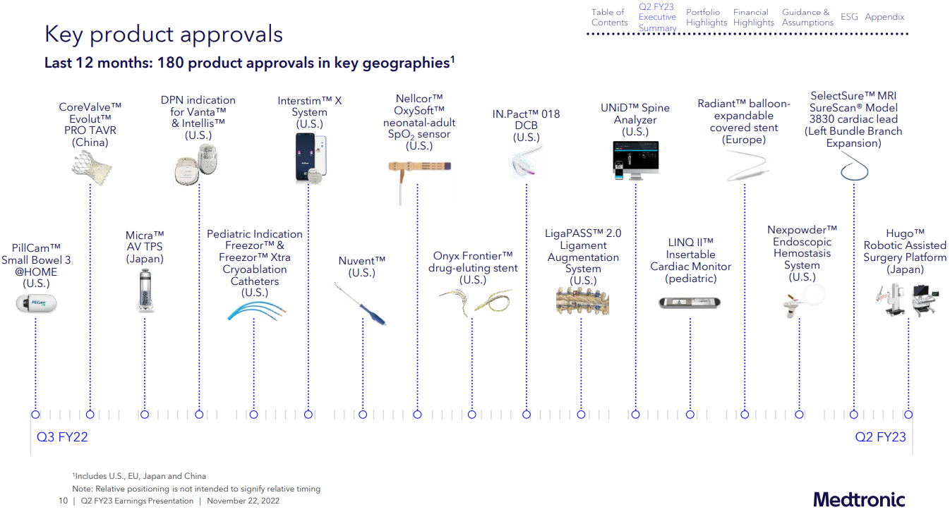 The result of all this spending is that the company has a huge intellectual property portfolio with nearly 86,000 awarded patents. This fact has allowed Medtronic to build a strong product pipeline across each of its business segments.
