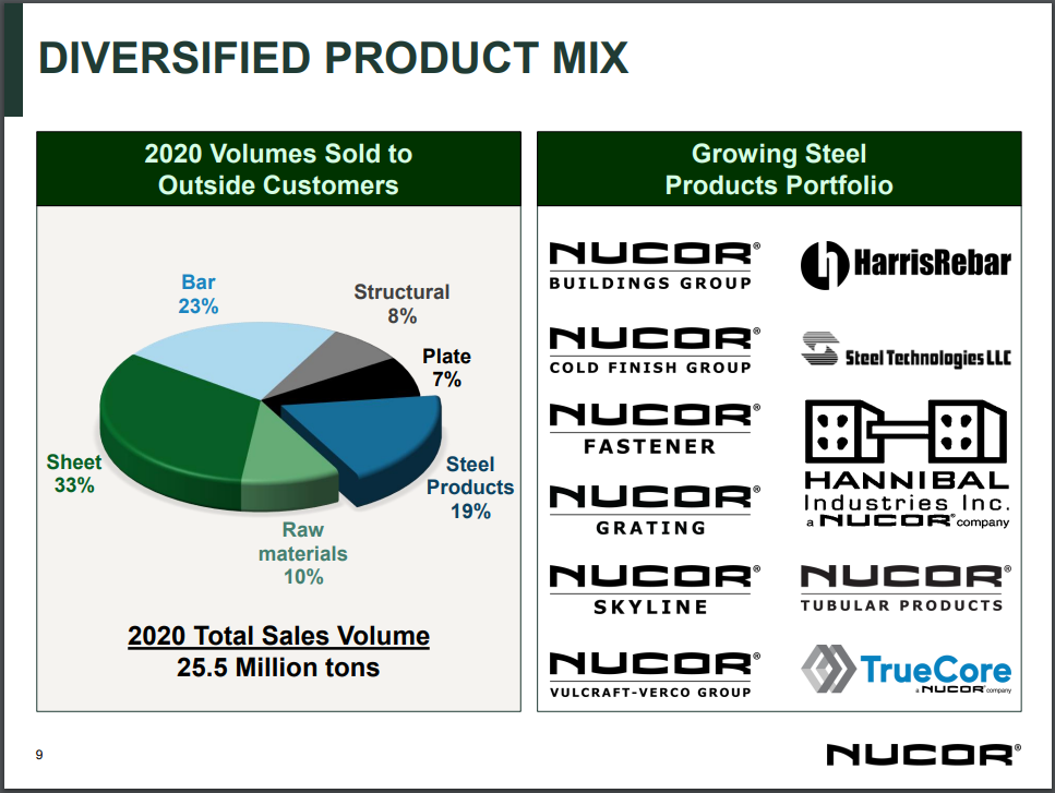 Nucor manufactures a wide variety of material types, including sheet steel, steel bars, structural formations, steel plates, downstream products, and raw materials. The majority of the company’s production comes from a combination of sheet and bar steel, as has been the case for many years.