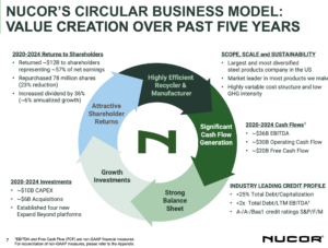 Despite challenging market conditions, Nucor maintained strong financial stability, with $4.14 billion in cash and short-term investments by year-end. The company’s steel mill operating rate for 2024 stood at 76%, slightly down from 78% in 2023. Capital expenditures on growth projects led to pre-tax costs of $594 million for the year, increasing from $400 million in 2023. Nucor continued its commitment to shareholder returns, repurchasing 13.1 million shares in 2024 and issuing its 207th consecutive quarterly dividend. The company has increased its dividend for 52 consecutive years.