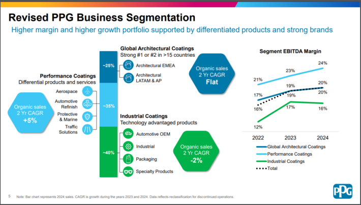 PPG is now virtually exclusively a coatings business. In recent years, the company has transformed away from legacy businesses like glass and chemicals, leaving it with a portfolio of coatings products that collectively generate nearly $16 billion in annual revenue. These businesses have largely seen improvements in margins in recent years.
