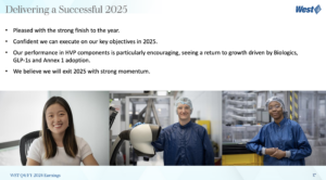 West Pharmaceutical Services reported its fourth-quarter and full-year 2024 financial results, with a 2.3% increase in net sales to $748.8 million for the quarter and a slight decline in adjusted diluted earnings per share (EPS) to $1.82. The company anticipates 2025 net sales between $2.875 billion and $2.905 billion, with adjusted diluted EPS ranging from $6.00 to $6.20. CEO Eric M. Green highlighted strong revenue and profit performance, emphasizing the positive impact of the company’s proprietary products and continued momentum in high-value products (HVP) for biologics and generics.