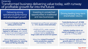 Upstream earnings were $21.4B, supported by record production of 4.7 million barrels of oil equivalent per day, the highest in over 40 years, with strong growth from the Permian (1.6M boe/d) and Guyana (over 700,000 gross barrels/day).