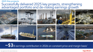 Capital expenditures totaled $29.0B in 2025, and the company expects $27–$29B in 2026. ExxonMobil has achieved $15.1B in structural cost savings since 2019, with a target of $20B by 2030, and brought 10 major projects online in 2025, expected to add $3B in earnings at constant prices.