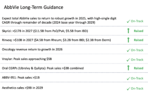 Humira once generated over half of AbbVie’s annual sales. Loss of patent exclusivity is a significant overhang; as a result, AbbVie’s total sales declined in 2023. At the same time, AbbVie also expects to return to sales growth in 2025, with high single-digit annual growth through the end of the decade.