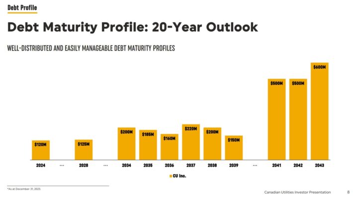 Another competitive advantage is the company’s strong financial position. Canadian Utilities has investment-grade credit ratings of BBB+ from Standard & Poor’s and A- from Fitch. This allows the company to raise capital at attractive interest rates.