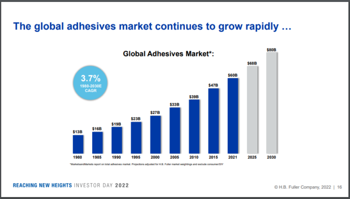 Thanks to the high fragmentation of this market, there is a significant growth potential for H.B. Fuller, which has consistently been the second-largest player in the market behind Henkel.