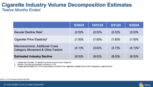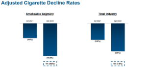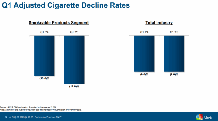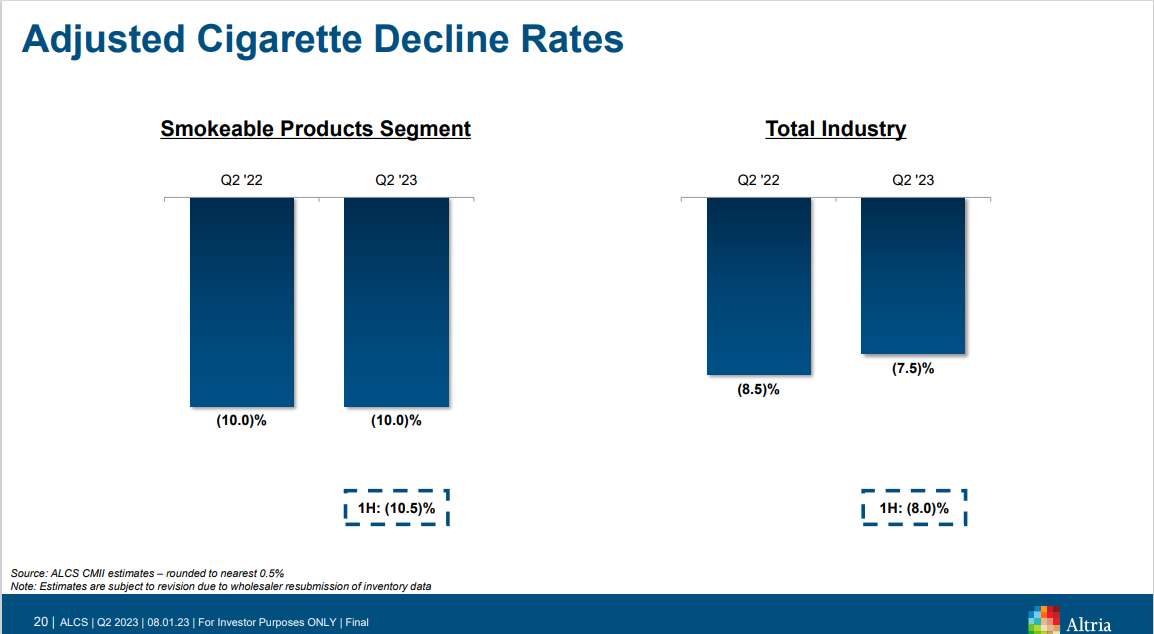 In its most recent quarterly results, the company reported that its smokeable products segment recorded a decline in domestic cigarette shipment volume of nearly 14% compared to last year when adjusted for trade inventory movement. This is not an issue particular to just Altria as the industry itself continues to see declining volumes.