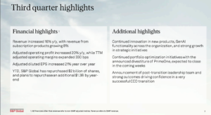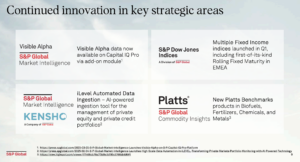 The company has also been very active in acquisitions and divestments to enhance its business. First, it completed a significant merger with HIS Market in February 2022. In December 2022, it acquired the Shades of Green business from the Center for International Climate Research, expanding S&P Global Ratings’ second-party opinions (SPOs) offering.