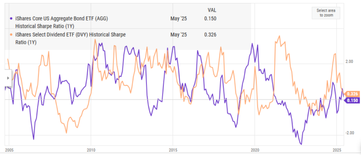 The trailing 1-year Sharpe Ratio for dividend stocks and bonds can be seen below.