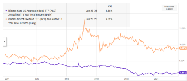 In the past 10 years, DVY has generated a total annualized return of 9.3%, nearly eight percentage points higher than AGG.