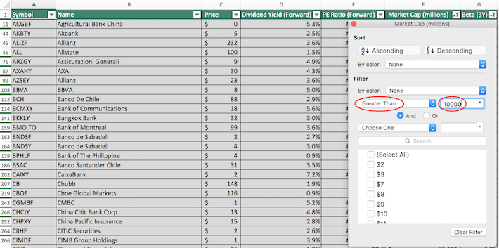 Step 5: Change the filter setting to “Greater Than” and input 10000 into the field beside it. Note that since market capitalization is measured in millions of dollars in this spreadsheet, inputting “$10,000 million” is equivalent to $10 billion.