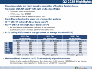 Looking ahead, the company plans to drill 5–5.5 net wells in Pembina in H2 2025, with production from a three-well pad expected in October. Hedging covers over 70% of natural gas and ~60% of light oil, and Delek Group’s strategic investment strengthens the growth potential. InPlay is positioned for continued production growth, debt reduction, and shareholder returns.