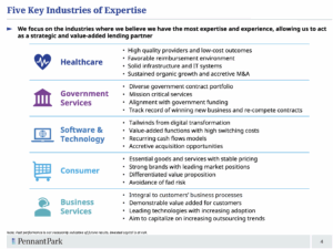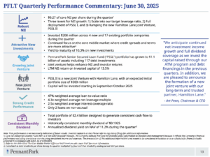 PennantPark focuses on first-lien, middle-market loans, giving it priority in repayments and higher yields. Its experienced management, strong deal-sourcing network, and partnerships like the joint venture with Hamilton Lane enable efficient portfolio growth. High exposure to variable-rate debt also allows the company to benefit from rising interest rates, supporting income and dividends.