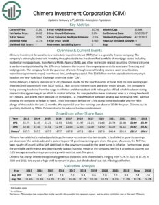Chimera Investment Corporation is a real estate investment trust (REIT) that is a specialty finance company. The company’s primary business is in investing through subsidiaries in a diversified portfolio of mortgage assets, including residential mortgage loans, Non-Agency RMBS, Agency CMBS, and other real estate related securities.