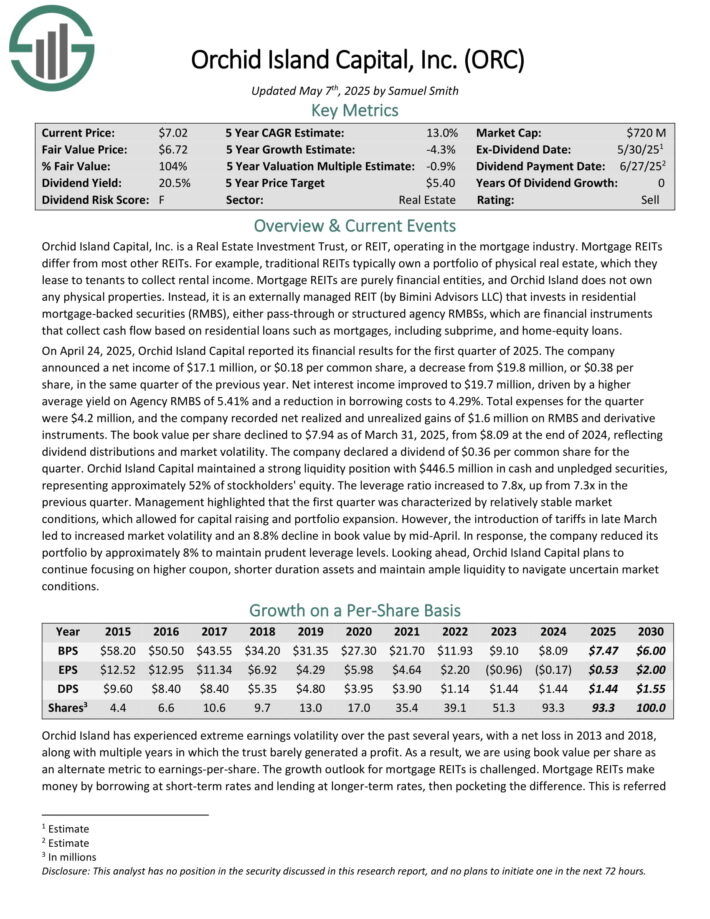 Orchid Island Capital is a mortgage REIT that is externally managed by Bimini Advisors LLC and focuses on investing in residential mortgage-backed securities (RMBS), including pass-through and structured agency RMBSs.