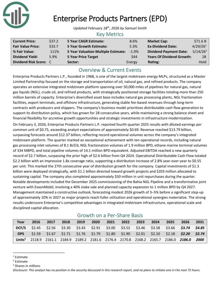 - High Dividend Stock #5: Enterprise Products Partners LP (EPD)