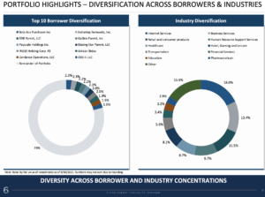 The investment portfolio remained diversified across sectors, with the largest allocations in Internet Services (35.5% of net assets), Healthcare (15%), and Human Resource Support Services (19.4%). The portfolio continues to emphasize first-lien loans with interest rates ranging from 7–12%, including some paid-in-kind (PIK) structures. Overall, the company maintained a stable NAV, controlled expenses, and delivered consistent net investment income despite minor portfolio losses and lower interest income.