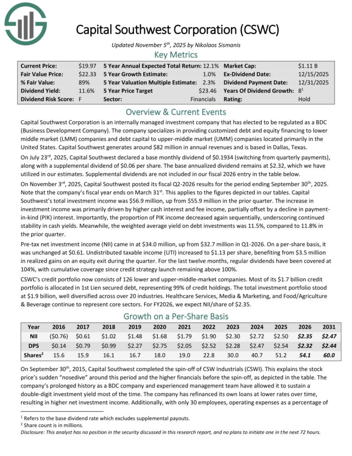 On November 3rd, 2025, Capital Southwest posted its fiscal Q2-2026 results for the period ending September 30th, 2025. Total investment income was $56.9 million, up from $55.9 million in the prior quarter.