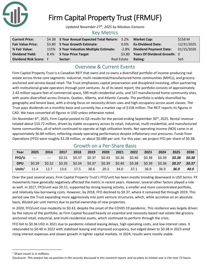 Firm Capital Property Trust is a Canadian REIT that owns and co-owns a diversified portfolio of income-producing real estate across three core segments: industrial, multi-residential/manufactured home communities (MHCs), and grocery anchored and service-based retail.