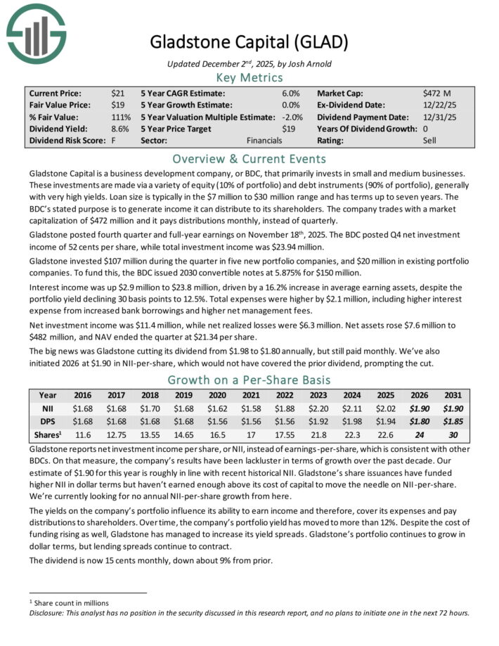 Gladstone posted fourth quarter and full-year earnings on November 18th, 2025. The BDC posted Q4 net investment income of 52 cents per share, while total investment income was $23.94 million.