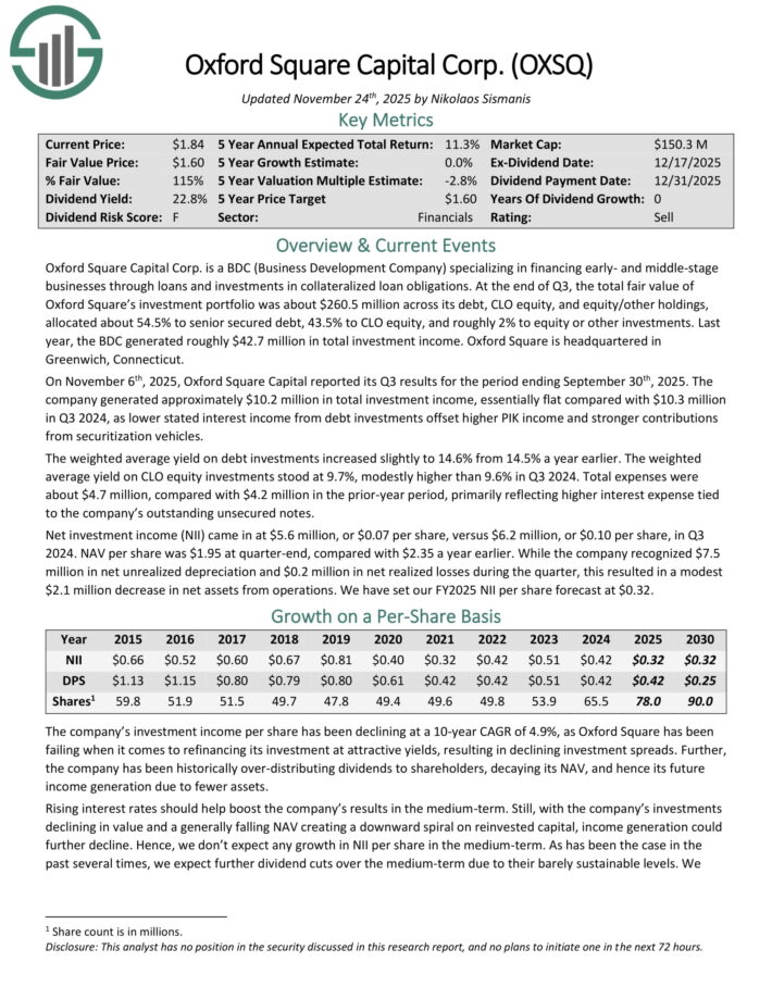 Oxford Square Capital Corp. is a BDC (Business Development Company) specializing in financing early- and middle-stage businesses through loans and investments in collateralized loan obligations.