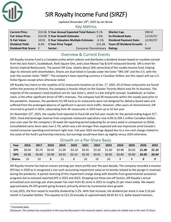 SIR Royalty Income Fund is a Canadian entity which collects and distributes a dividend stream based on royalties earned from the Jack Astor’s, Scaddabush, Reds Square One, and Loose Moose Tap & Grill restaurant brands.