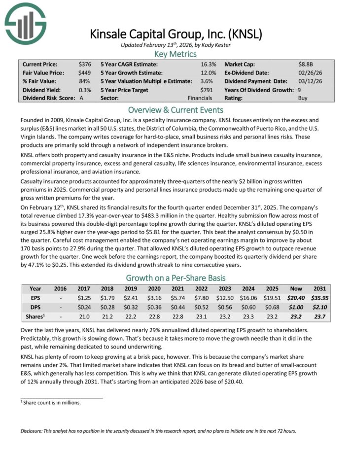 Click here to download our most recent Sure Analysis report on KNSL (preview of page 1 of 3 shown below):