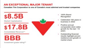 Since its IPO, CT REIT has acquired and leased more than 2 million square feet of industrial properties to Canadian Tire Corporation. In addition, other properties of Canadian Tire Corporation are likely to meet CT REIT’s investment criteria.