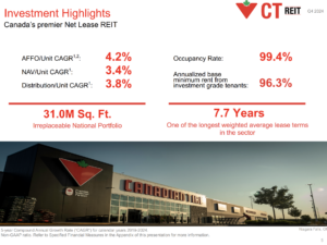 The REIT maintained a high occupancy rate of 99.4% and an indebtedness ratio of 41.1%. CT REIT continues to capitalize on its development pipeline and strong balance sheet to generate consistent returns for unitholders.