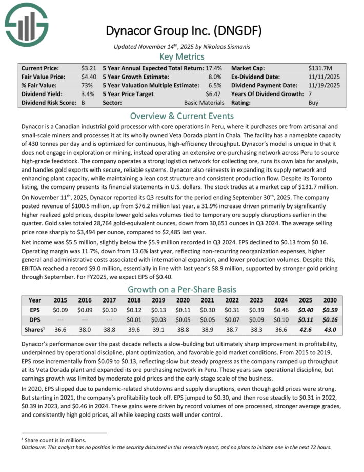 On November 11th, 2025, Dynacor reported its Q3 results. The company posted revenue of $100.5 million, up from $76.2 million last year, a 31.9% increase driven primarily by significantly higher realized gold prices, despite lower gold sales volumes tied to temporary ore supply disruptions earlier in the quarter.