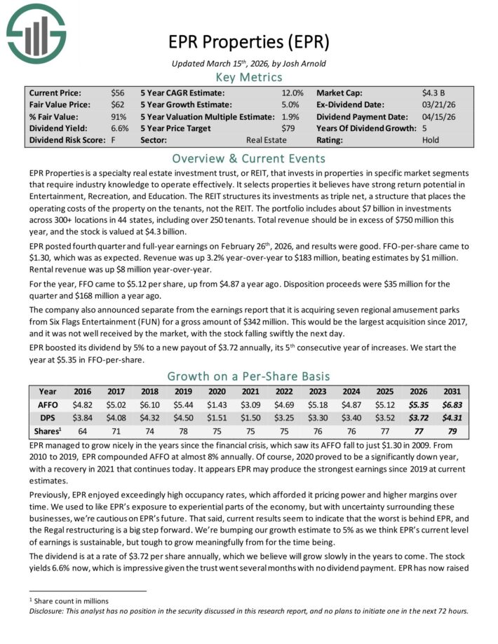EPR boosted its dividend by 5% to a new payout of $3.72 annually, its 5th consecutive year of increases.