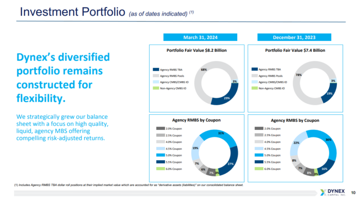 Tangible net book value per common share decreased 5.3% to $7.81 from $8.25, yielding a -1.0% economic return, driven by $0.36 dividends and a $0.44 decline in book value. The investment portfolio totaled $82.3 billion, including $73.3 billion in Agency MBS and $8.3 billion in TBA securities, with leverage at 7.6x tangible net book value.