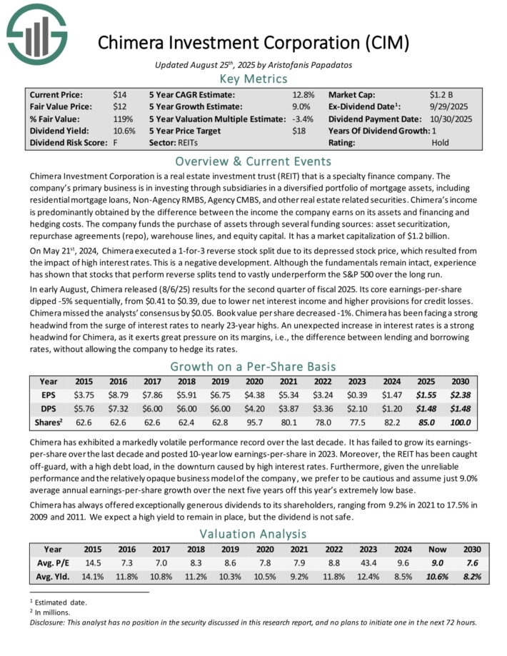 In early August, Chimera released (8/6/25) results for the second quarter of fiscal 2025. Its core earnings-per-share dipped -5% sequentially, from $0.41 to $0.39, due to lower net interest income and higher provisions for credit losses.