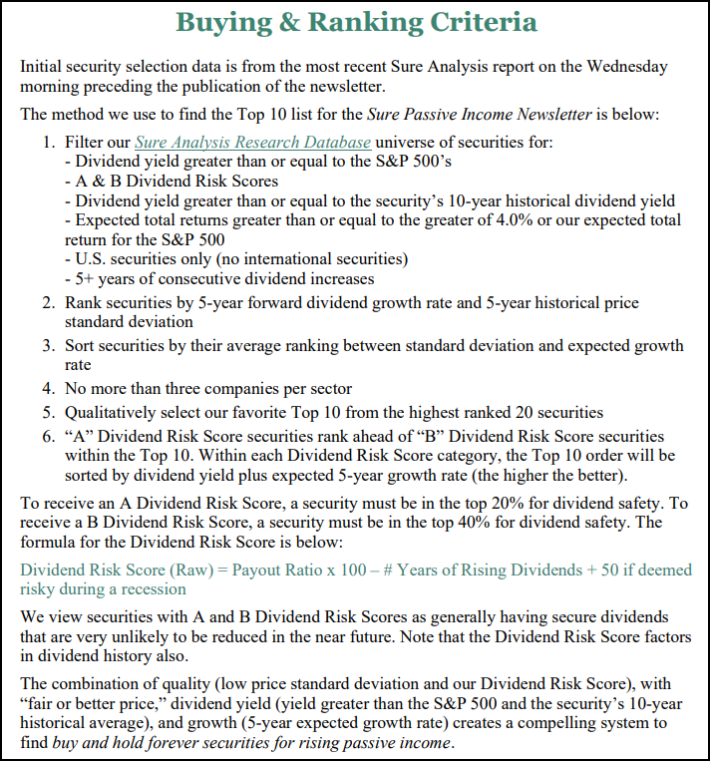The end result is a concise list of our Top 10 buy and hold forever securities for rising passive income published each month in the Sure Dividend Growth Newsletter.