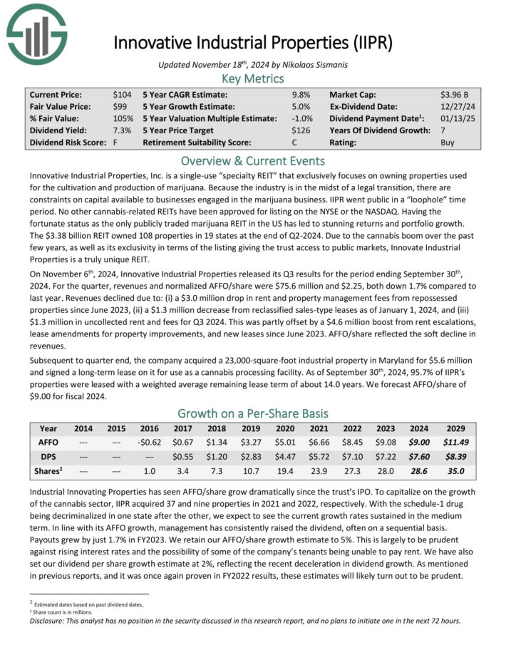 On November 6th, 2024, Innovative Industrial Properties released its Q3 results for the period ending September 30th, 2024. For the quarter, revenues and normalized AFFO/share were $75.6 million and $2.25, both down 1.7% compared to last year.