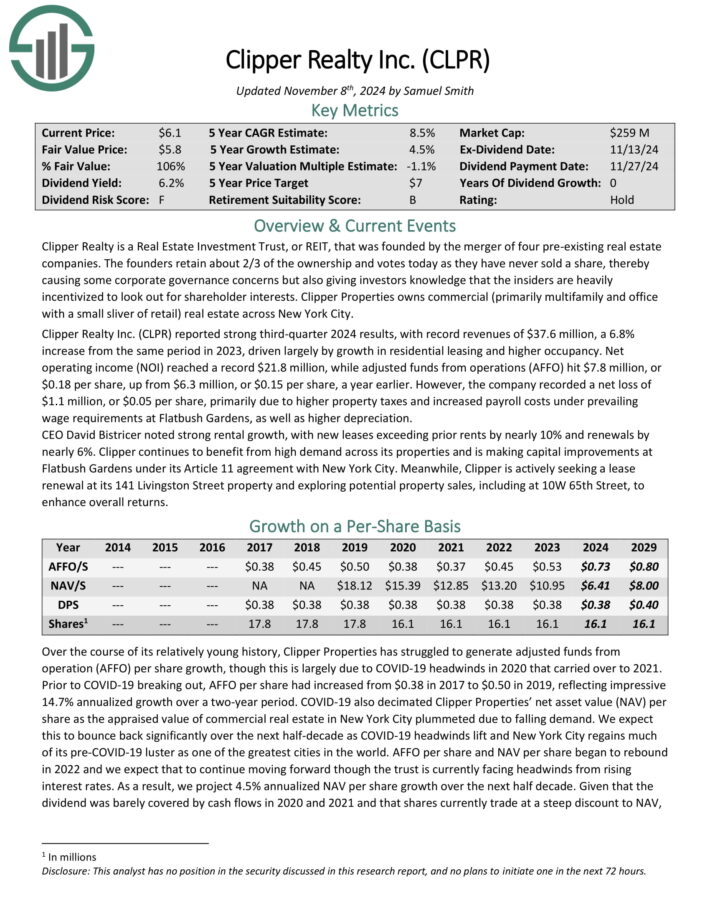 Click here to download our most recent Sure Analysis report on CLPR (preview of page 1 of 3 shown below):