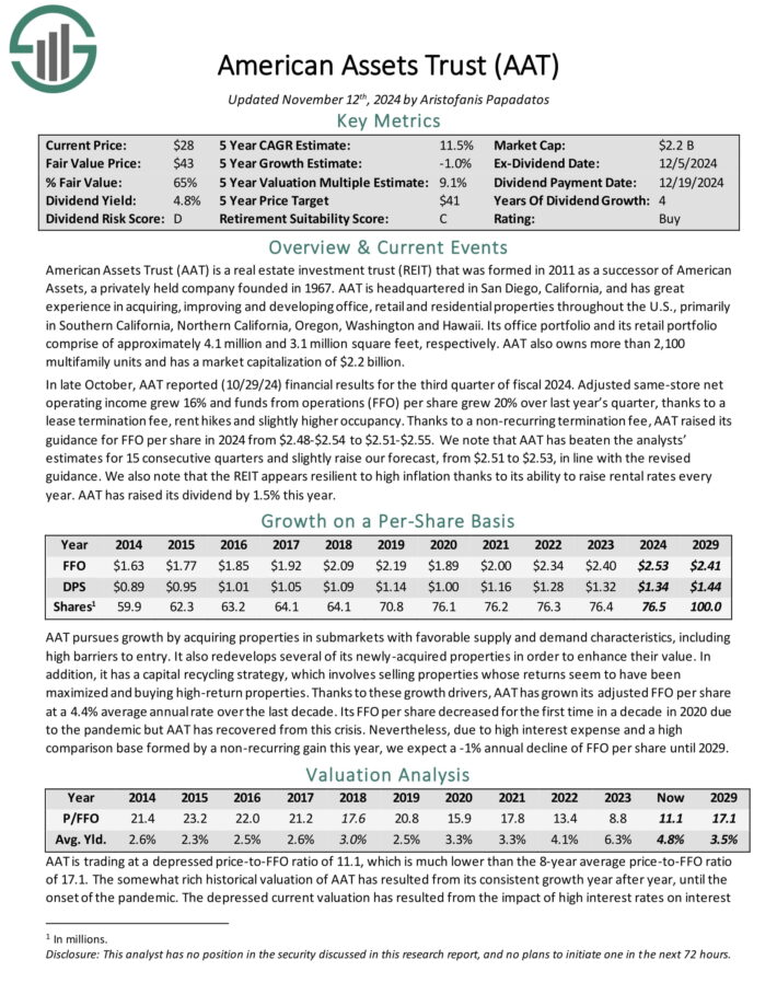 Thanks to a non-recurring termination fee, AAT raised its guidance for FFO per share in 2024 from $2.48-$2.54 to $2.51-$2.55.