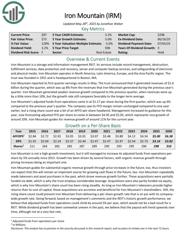 Management increased its guidance for this year, now forecasting adjusted FFO-per-share to come in between $4.95 and $5.05, which represents nice growth of around 10%. Iron Mountain guides for revenue growth of around 11% for the current year.